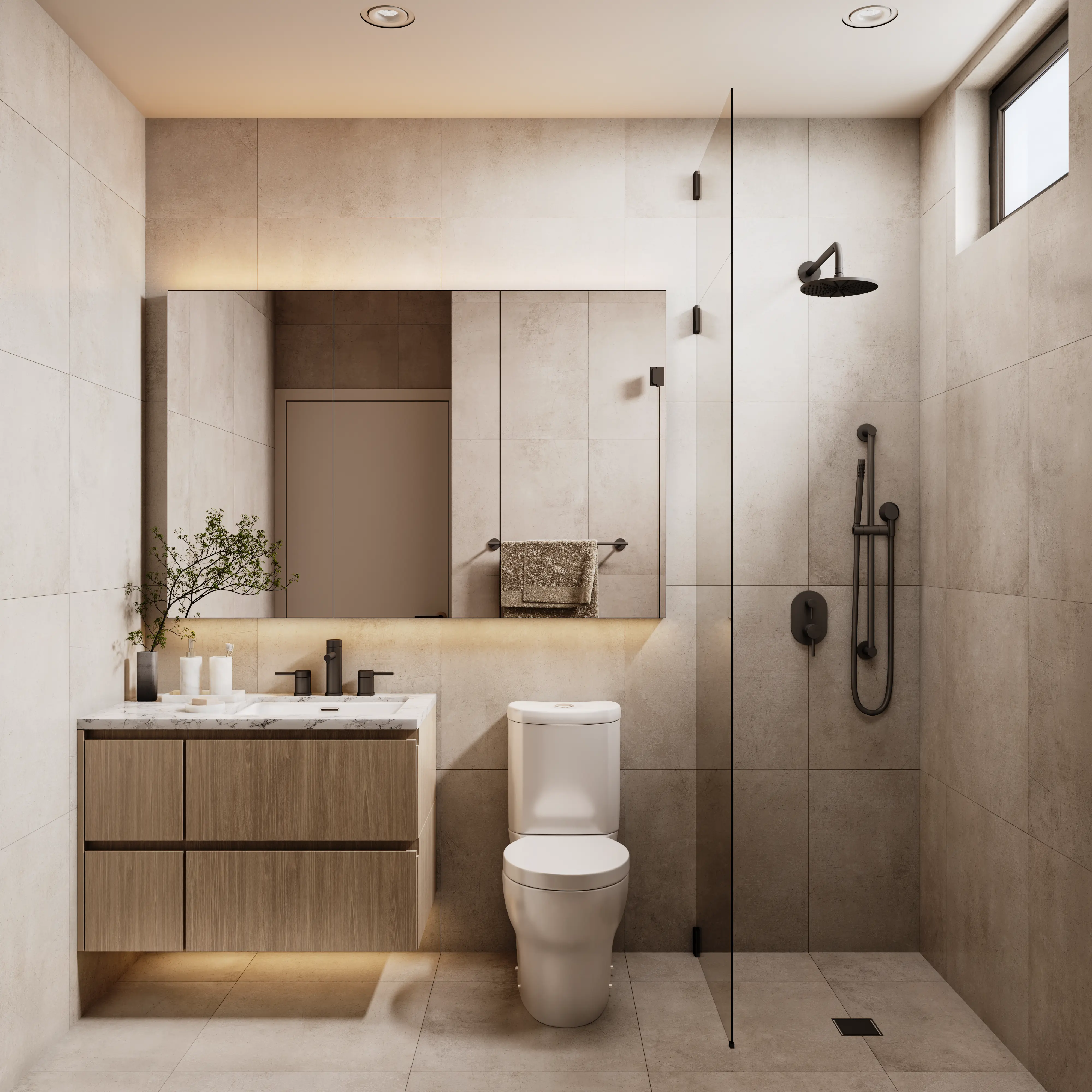 Retreat to spa-inspired bathrooms with floating vanities, under-cabinet lighting, frameless glass showers, and matte black fixtures—your private sanctuary at the end of the day.